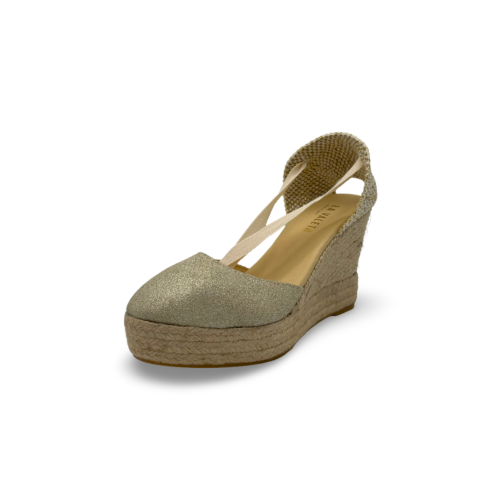 En Mesa Calzados, te presentamos estas elegantes cuñas de la marca LA VALETA, confeccionadas en tejido brillante color dorado que aporta un toque sofisticado a cualquier look. Su diseño con cintas para atar al tobillo y cuña forrada en yute las convierte en el calzado perfecto para combinar con vestidos veraniegos, looks de fiesta o incluso estilismos más casuales.